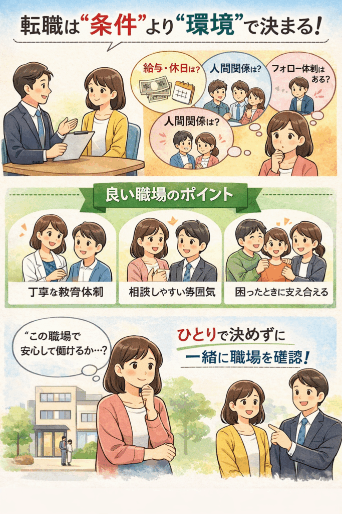 「この職場で自分は安心して働けそうか?」という視点を持ち、 環境まで含めて一緒に確認することが、後悔しない転職につながります。