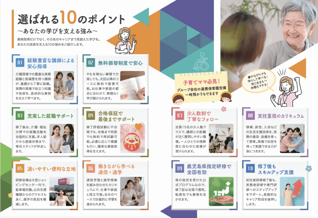 - 研修修了後には、鹿児島の介護・福祉求人をご紹介