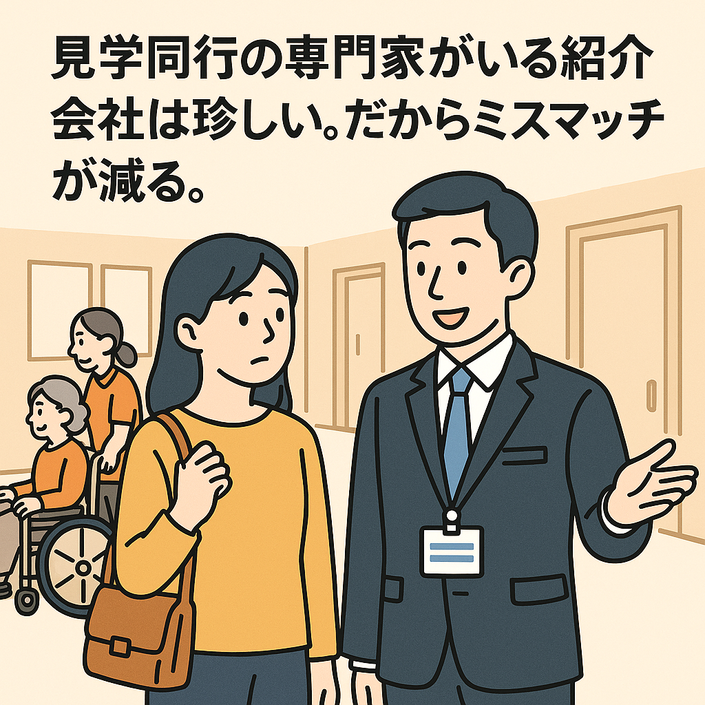 私たちが見学同行にこだわる理由は、紹介件数を増やすためではなく、定着率を高めるためです。
