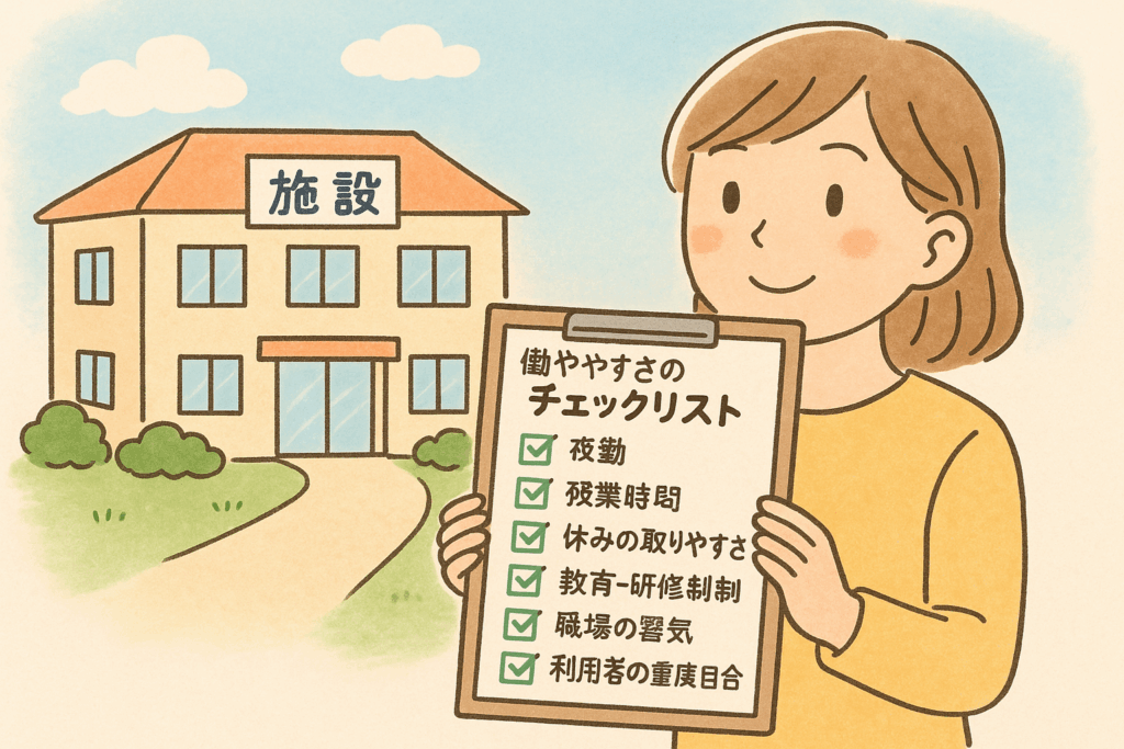 夜勤や残業、休みの取りやすさ、研修体制、職場の雰囲気、利用者さまの重度度合いなど、気になる点は遠慮せず質問してみてください。