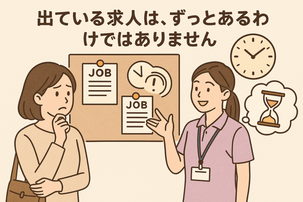出ている求人は、ずっとあるわけではありません。 とくに働きやすさや条件の良さが整っている求人ほど、募集が始まっても短期間で締め切られることがあります。