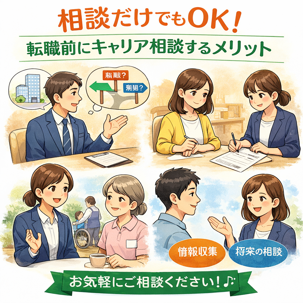 キャリア相談は「転職を決める場」ではなく、今の働き方や将来の選択肢を整理する場です。 現状の不安・希望条件・優先順位を言語化するだけでも判断がラクになります。